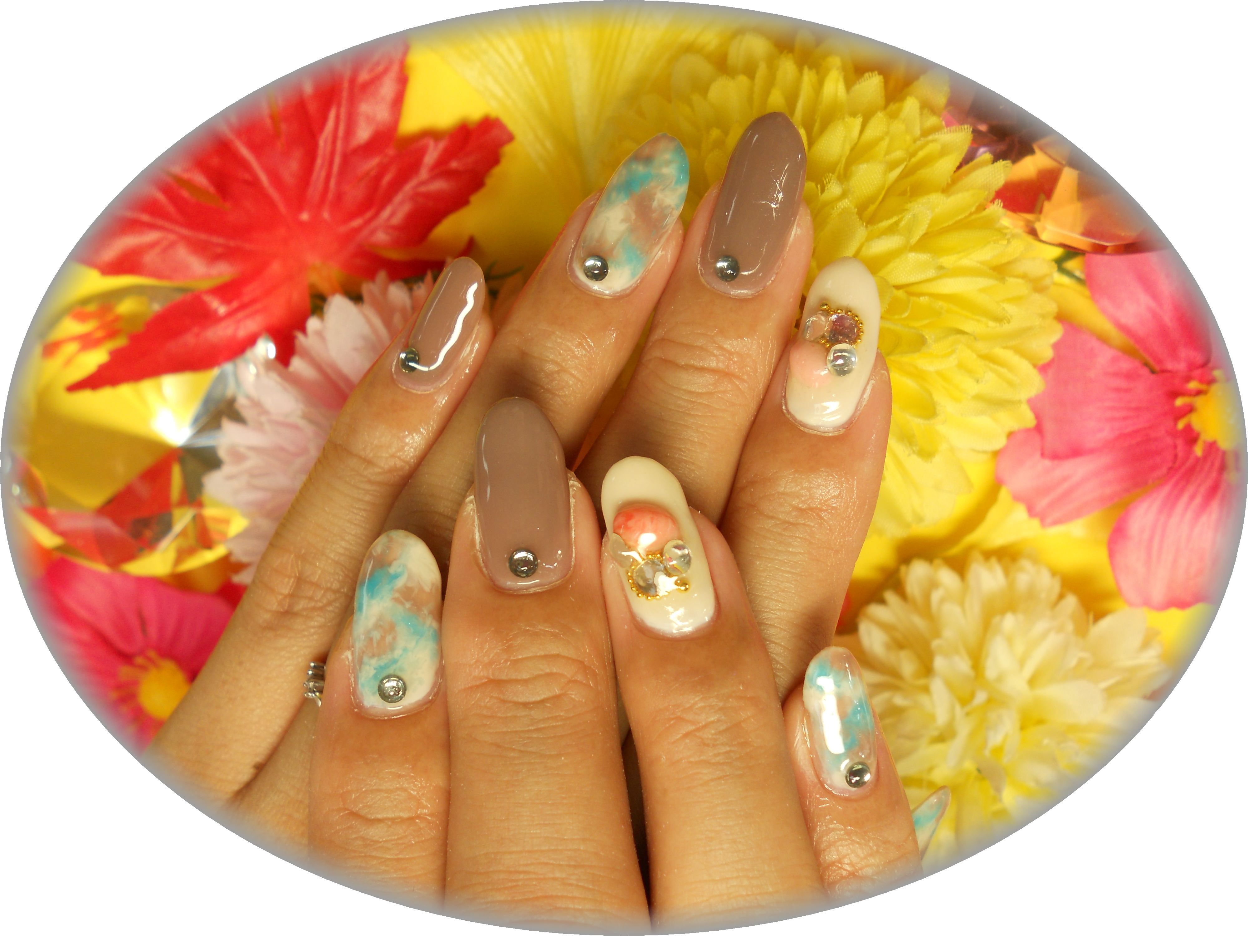 オフホワイトの上にターコイズ&ブラウンでタッピング技術をもりこんで!