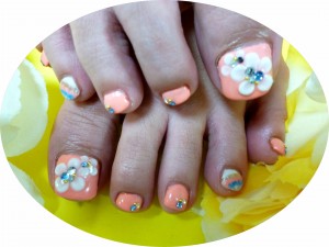 ベースのピンクオレンジに3Dのお花