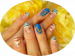 先端フレンチに赤・青のボーダーラインをペイント